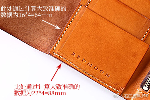 这时候我们就要依靠钱夹展开后一个重要的参照点来推导各个部件的尺寸了,那么这个参照点就是斩孔,虽然现在市面上的工具斩型号很多,抛开法斩不说,也抛开机器缝制和手工缝制不讨论(因为redmoon多数部位都是机器缝制的),多数情况下斩孔的间距都是可以判断出来的,比如redmoon多数情况下都是4mm孔距的,而且在宽度140mm已经确定的情况下,也是可以利用已知宽度的孔数进一步计算出孔距的。4mm孔距确定下来后我们就可以用笨拙的数孔位的方法来计算各个部件的尺寸了。