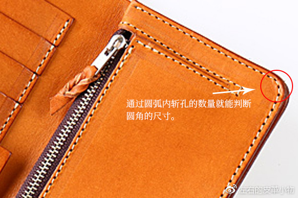 最后就是钱夹圆角的设置了,因为有圆角尺的存在,我们设定这个要方便许多,简单如放大照片直接用尺子做比对,找到合适角度的圆角即可。复杂的话,也可以通过圆弧上斩孔的数量来判断圆角的规格。